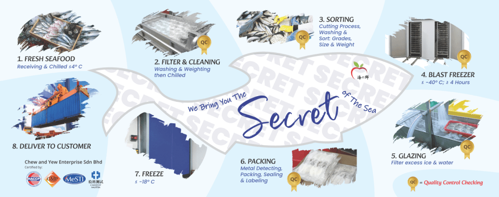 From the moment fresh seafood is delivered to our premise, it is carefully handled through chilling, cleaning, sorting, freezing, glazing, and packing—all under controlled temperatures.